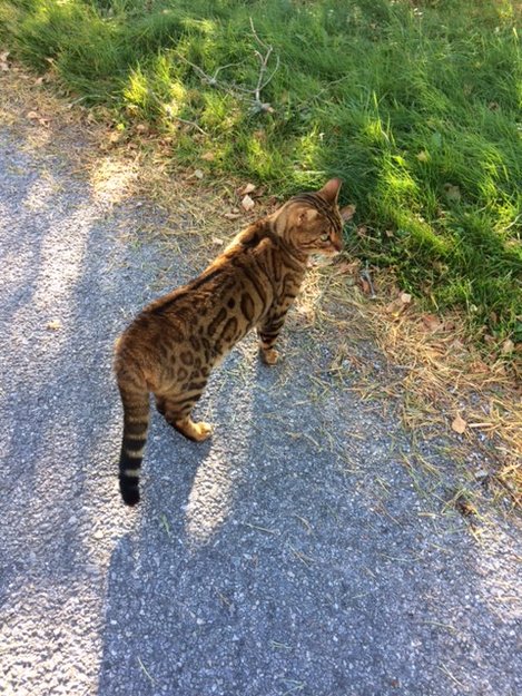 Brunmønstret hannkatt, ser ut som en liten gepard. Litt skvetten og ikke så kosete.