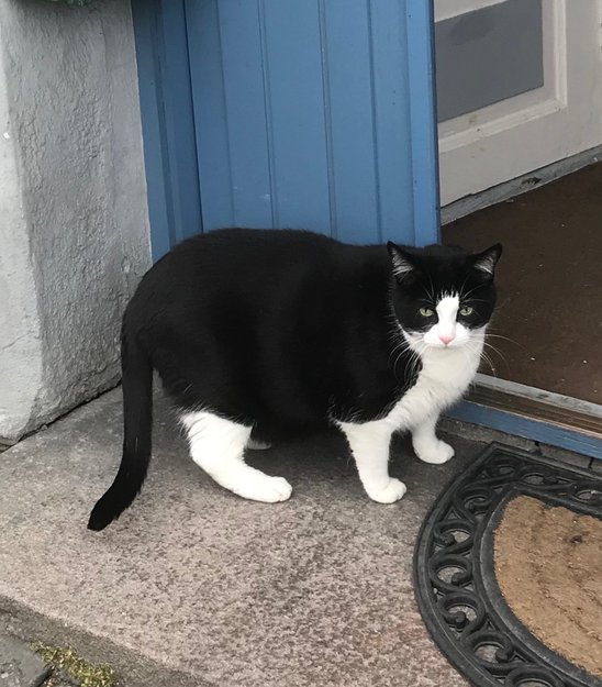 Tux er en ganske stor, korthåret sort og hvit pus, med hvite poter og hvitt i ansiktet, ellers sort. Tux er sterilisert og har microchip, men vi har ikke ID-nummeret. Han er sky og skeptisk.