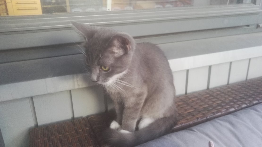Kattungen, 4 mnd, grå med hvitt enden av benene