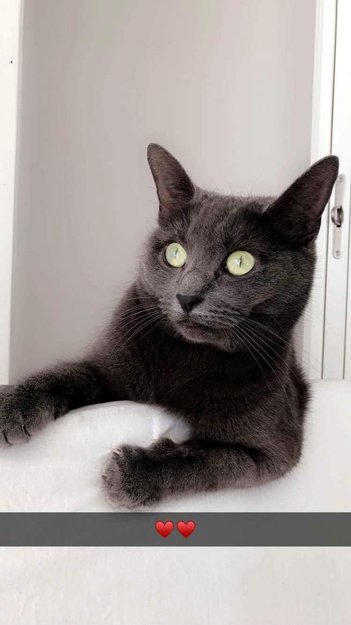 Mørk grå ensfarget, grønne øyne (gulgrønne) . Svart nese og pelsen er myk og kompakt. Veldig kosen og ikke redd.