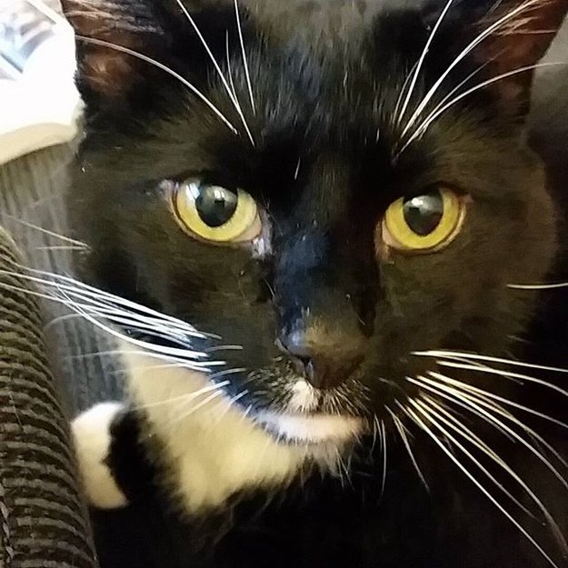 Svart med hvitt bryst og buk, hvite poter og hvitt på høyre side av overleppen. ID tatovering i venstre øre. Han er ganske tillitsfull og kommer når man lokker på ham med navnet. Har hengebuk som de fleste kastrerte hannkatter.