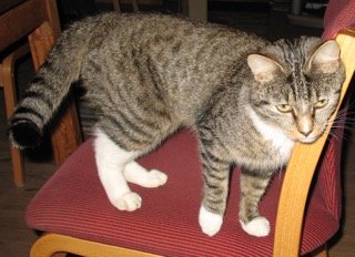 Steffi er gråstripet med noe beige og har hvit hals og hvite føtter sokker frambein og hvit til over hasene på bakbeina