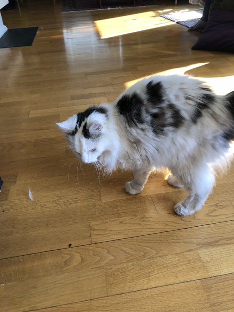 Pus dukket opp utenfor vårt hus første gang for ca. To uker siden. Virker menneskekjent og husvarm, men skitten og sulten. Har hatt besøk av mann med chippleser, pus har ingen chipp.