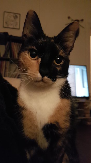 Voksen hunnkatt som er liten. Er tricolor med lysebrun, svart og hvit pels