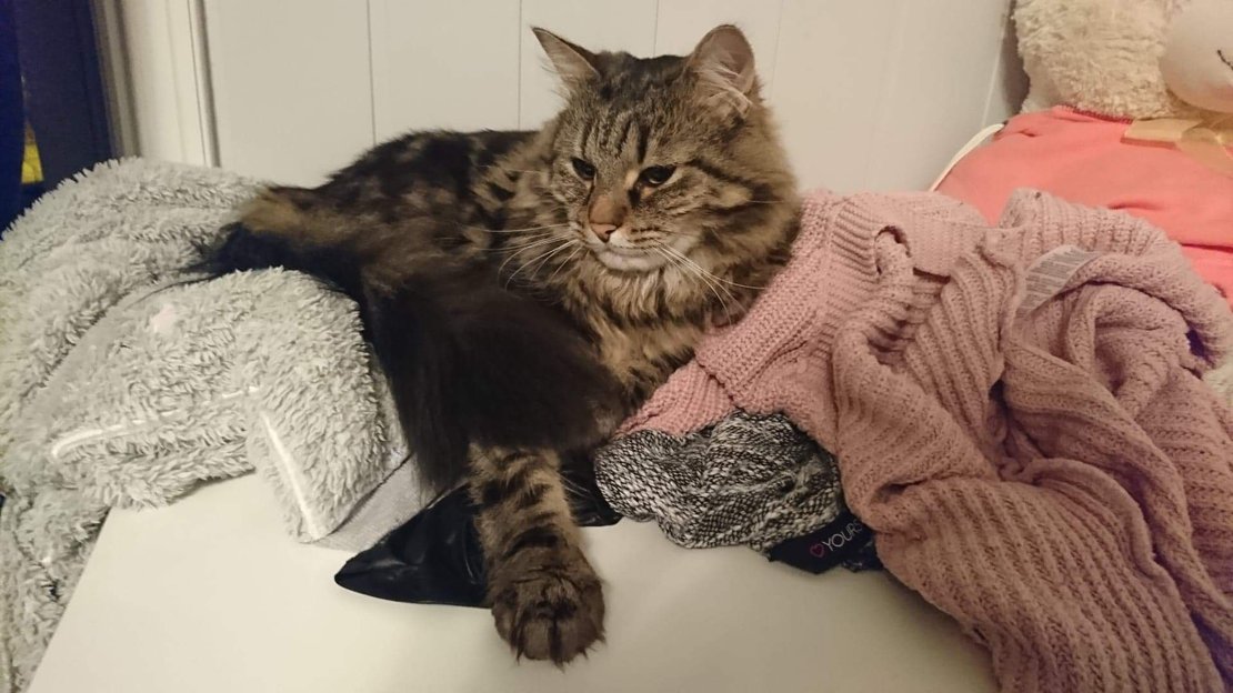 Ganske stor og kraftig men ikke tjukk. Glatt i pelsen. Fargene er svart/mørk brun og lys. Dette er en pus som ikke nærmer seg fremmede og er veldig usikker. Han har også på seg et rosa halsbånd med reflex(om han ikke har fått det av seg)