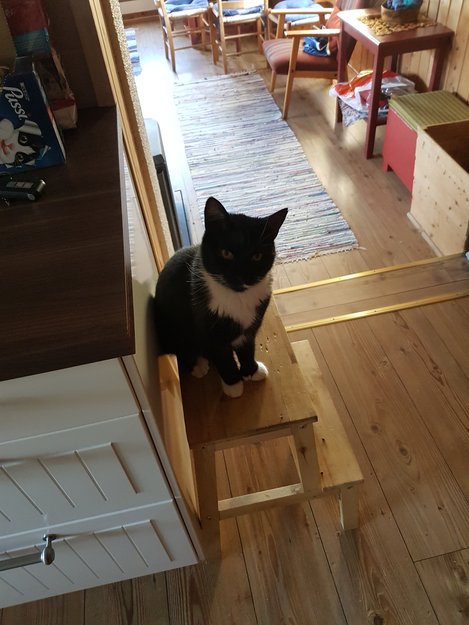 katten er en skipskatt, det vil si fem tær på forpotene. Eierne bor på Charlottenlund så det kan hende den er på vei i den retningen? Eieren husker ikke id merkingen men den er registret på henne.