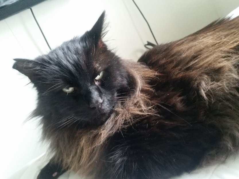 Katten er nettopp adoptert hit, og er ukjent i området. Han er 9 år gammel og har vært utekatt hele livet, og ville sannsynligvis "hjem" igjen. Han er ganske stor og veldig kosete og tillitsfull, så om noen finner han er det ikke noe problem å bære han med seg inn.