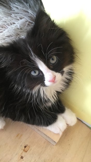 Han är bara 4 månader gammal (ändå ganska stor) och utan halsband, men han lyssnar till sitt namn. Svart och vit hankatt.
