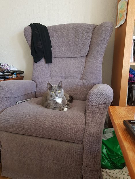 Hun er grå med litt svake striper i pelsen på ryggen, hvit på halsen og potene. Litt liten i størrelse. Hun er sterilisert, vaksinert og chippet. Veldig kosetet, men litt redd og skvetten.