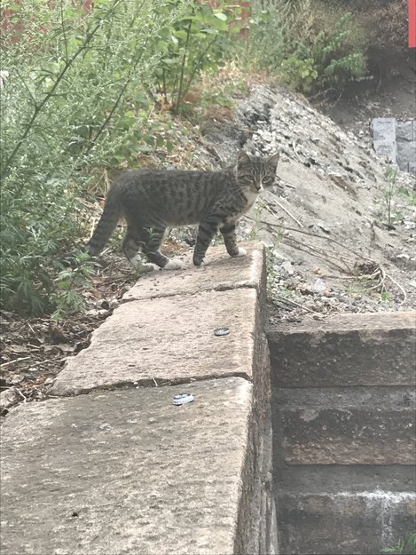 En ung katt har vandret rundt bygningene Stensberggata 15/13 i ett par dager nå. Jeg vet ikke om den bor i nærheten eller ikke, men synes det er litt rart med en utekatt i dette området. Katten er veldig leken, nyskjerrig, men også ganske skvetten. Ser frisk ut.
