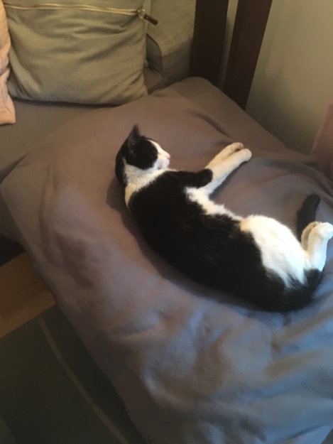 halen er svart lang og slank. En slank katt, med slanke poter og ben. Elsker å bli tatt på magen(kost på magen). Ca 2 år gammel.