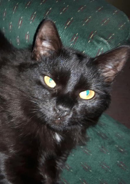 Hun er langpels svart katt og har en hvit stjerne på bryste.