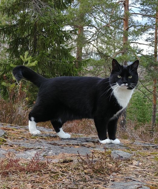 Svart og hvit (tuxedocat) pels. 4 Hvite poter, hvitt bryst og hvit rundt munnen og hvite værhår ellers svart.