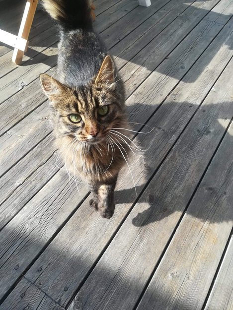 Katten var ekstremt sulten og tørst da den dukket opp hos oss, veldig sosial og mjauer for å komme inn om natten.