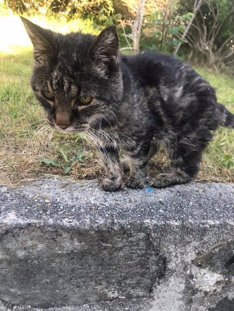 Oppholder seg i Øygarden nærmere bestemt på Toft, ved bommen før bølgekraftværket. Oppholdt seg rundt huset i en ukes tid, mjauer mye, vil ha oppmerksomhet og ser tynn og sliten ut.