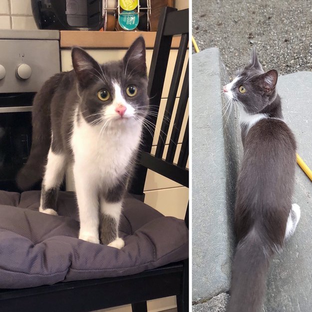 Grå med hvite markeringer på hake/nese, bryst/hals, bein og mage. Ene forbeinet er helt hvitt. Rosa nese og gule øyne. Ganske korthåret pels. Liten og ung, ca. 5-6 mnd gammel.