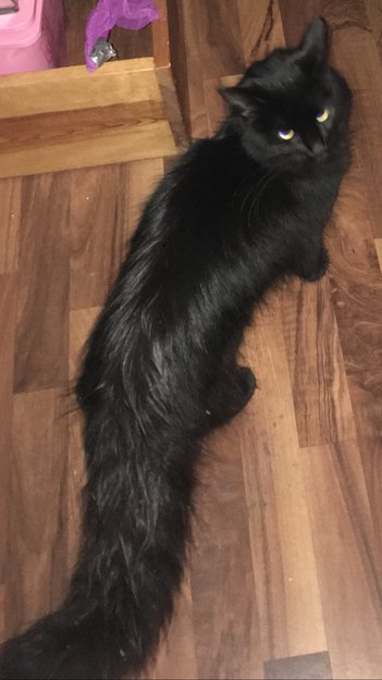 Hun er svart men kan se brunsvart ut i sollys. Hun har mellomlang pels og en ganske fluffy hale. (Silkemyk pels) Hun har noen hvite hårstrå som ikke sees ved første øyekast. Hun veier/veide ca 2,5kg. Hadde på seg en rød sele når hun forsvant. Vanligvis ikke redd for verken folk eller hunder. Men kan jo være d nå som hun er ute.