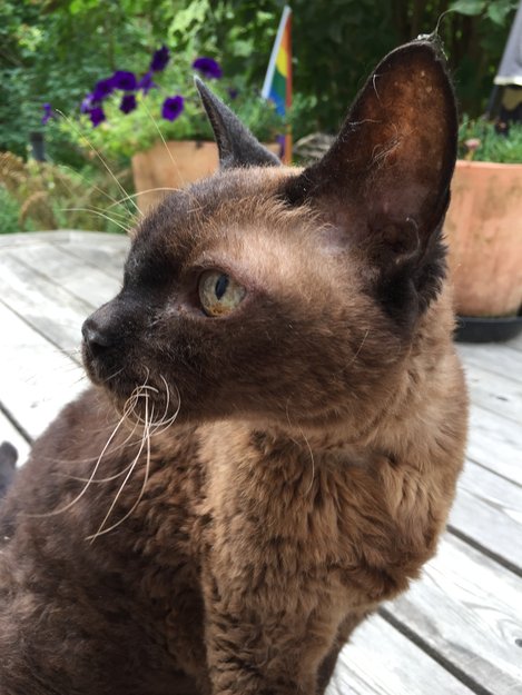 Hun virker som en blandrase med siames. Krøllete værhår. Hengemage. Grønne øyner med brune inslag.