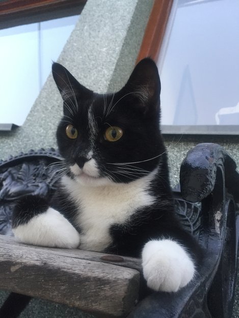 Svart katt med hvitt understell, har også en hvit stripe over ansiktet.