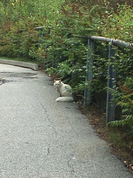 Hvit katt observert på veien fra storavatnet terminal mot rundkjøringen i olsvikskjenet, veldig menneskesky og ser ut til å ikke finne veien hjem. Mulig katten halter på venstre bakben og er skitten i pelsen sin