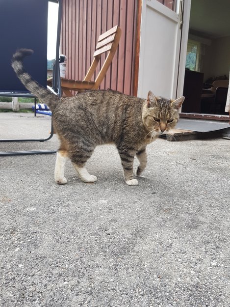 Liten guttepus kom på besøk lørdags kveld og har siden nektet å gå så mye som 50 meter fra huset. Kosesyk og utsultet. Katten har vært observert i området tidligere i sommer.