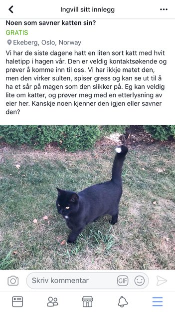 Sort katt med hvit haletipp har vært veldig kontaktsøkende og holder seg i hagen vår og naboens. Den virker forlatt... Katten prøver å komme seg inn no på kvelden. Tror den var i krangel m nabokatten forrige natt, det kunne høres sånn ut. Håper det er noen som kjenner denne katten og vil komme og hente. Vi har ikkje gitt den mat, men den virker sulten.