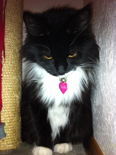 Stella er en svart, langhåret katt, med hvite poter og hvitt bryst. Andre kjennetegn er at hun har en knekk ytterst på halen. Stella er chipmerket, men er ikke øremerket.