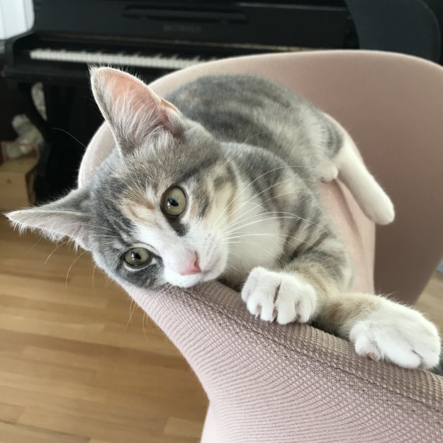 Nøste er snart 9 mndr, relativt liten av str. Hvit, grå og brun. Øremerket. Kan være litt skeptisk.