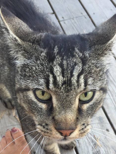Han (Tror det er en hannkatt) Kom til meg på hytta og var veldig kontaktsøkende, ville inn i hytta, men jeg har en annen hannkatt som ikke er veldig happy for det. Ga den tørrfor, var skrubbsulten. Den har kommet hit hver dag. Den siste uka har den helt slått seg til på verandaen her.