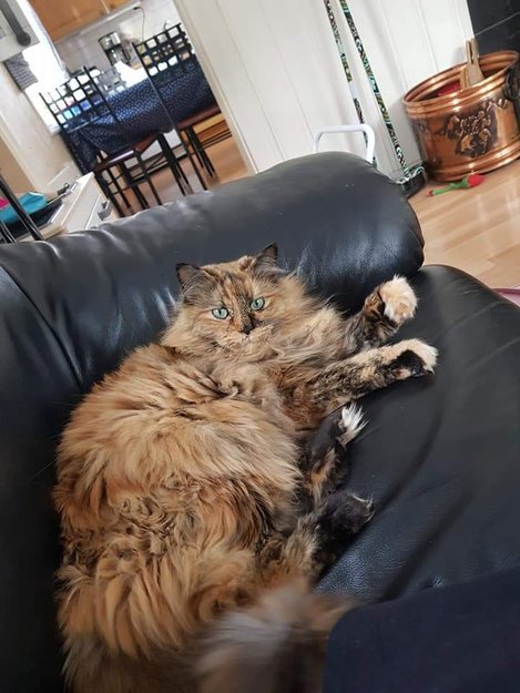 Stor langhåret,skildpaddemønstret hunnkatt med gul/blå/grønne øyne. Meget spesiell øyenfarge som blir lagt merke til. Er chippet og står i min samboers navn på Tor Arne Larsen.