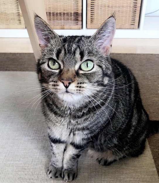 Lite hode, litt overvektig. Glad i folk. Liker kos på hodet. Snill, men litt skvetten.