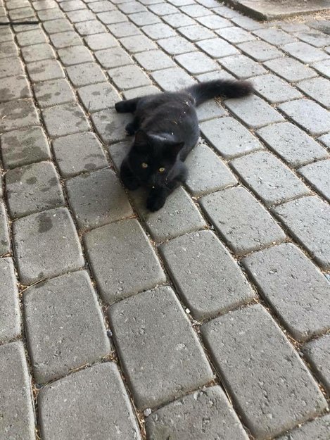 Svart med hvite flekker på brystet og mellom bak beina. Og litt på venstre bak labb. Veterinær tror den er 5-6 mnd men ikke alltid lett og bedømme