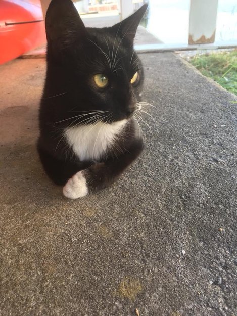 Denne fine rolige og konsaktsøkende katten dukket plutselig opp her. Ser ut til å lett finne seg til rette og er ikke redd hund!