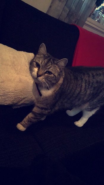 Hun er hvit med grå tigerstriper. Hvite poter. Hadde halsbånd når hun forsvant. Hun er 11 år og veldig slank. Supersnill, men kan være litt unnvikende.