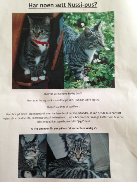 Var sist hjemme 20 juli. Har bodd her bare to måneder, bodde tidligere i tolfsrudgrenda i Holmestrand.Har slåss en del med nabokattene. Kan hende hun ikke trivdes med alle kattene og at hun er blitt "jagd" vekk, eller at noe har skjedd hun.