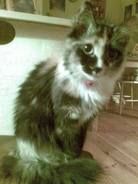 Semi lang håret. Kortere pels på bena,lang pels på kroppen og lengre pels på halen. Hun has masse hvite barter og hvite værhår. Hun har på seg et rødt kattunge halsbånd uten bjelle.