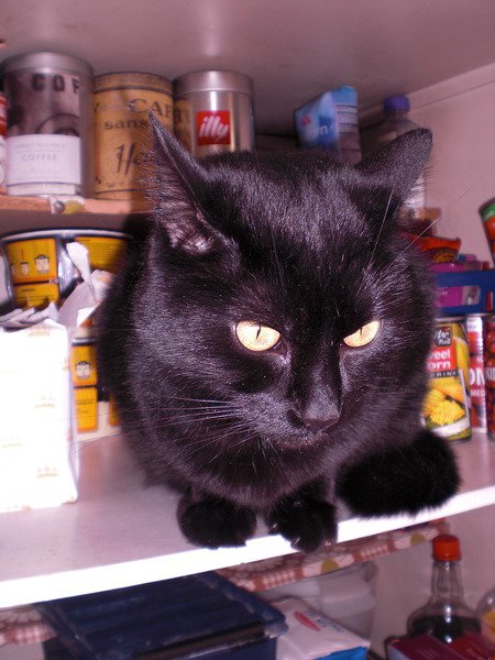 Korthåret sort hankatt. Litt folkesky, men veldig snill og kosete.