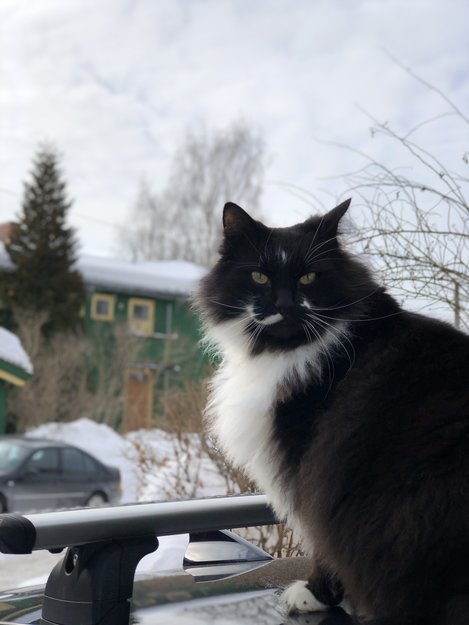 Svart og hvit langhåret hannkatt. Hvitt bryst og hvite poter. Glad i kos men skvetten.
