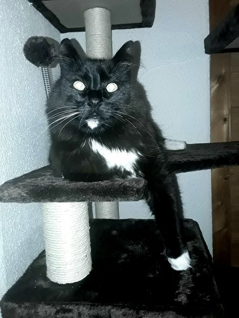Sort med hvit hake. Hvit flekk på brystet. Hvite poter. En hvit bart og en sort. Stor gutt veier 7 kg . 8 år.
