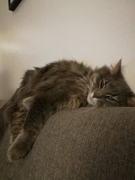 Liten hunnkatt, med lyseblått halsbånd med bjelle på. Grå, lang pels med hvit rundt øynene og under haka og rundt snuta. Menneskekjær og kontaktsøkende.