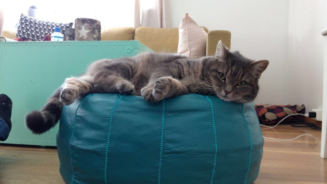 Mellomstor hunnkatt på tre år, grå/beige i farge med noe mønster på sidene.
