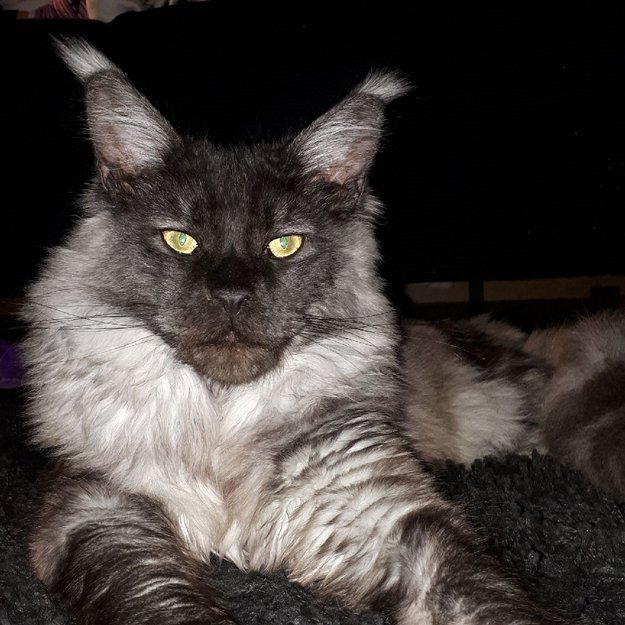 Fargen heter smoke og han er sortgrå med lysere felter i nakke hals mage og hale.