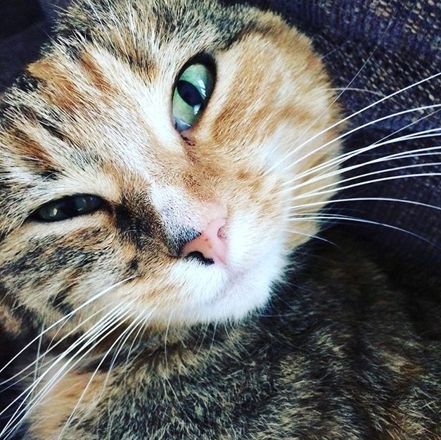 Da hørte vi masse mjauing utenfor og pusemor kom hjem skrubbsulten og tørst men like hel. Nå sover hun mett og fornøyd i sengen hos sønnen min.. Stor glede❤️