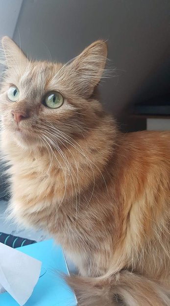 Hun er bare Orangefarge og grønne øyne. Hun heter Pelis og hun 3 år siden. Hun har chippet.