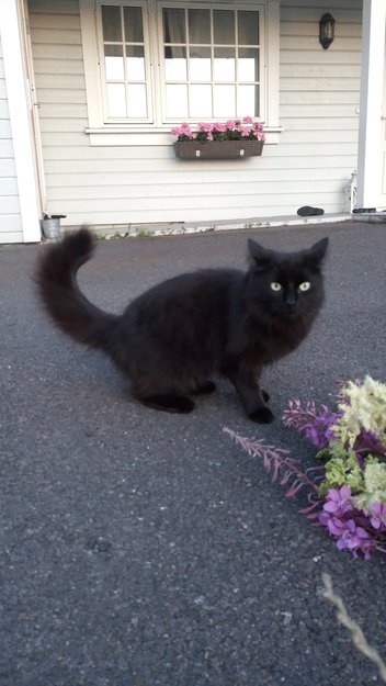Helt svart hunkatt, i lys kan hun ha litt brunskjær i pelsen. Lang pels. Ett år og tre måneder gammel, litt mindre av vekst enn voksne hunkatter ofte er. Buskete hår som stikker ut av ørene.