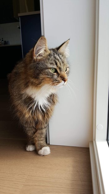 Pelsen er noe ugjevn, særlig ved halerot (etter klipp pga skade) og siden av ryggen (etter klipp). Kan virke nervøs, og mjauer ganske svakt. Har hvitt brystparti opp til munnen. Hvite "sokker". Ellers en kosete katt som godt kan oppsøke fremmede for mat og lignende. Har ikke tatovering i øret enda, men er chippet.