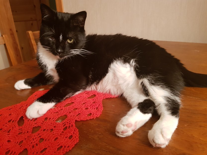 3 år. Generelt liten av vekst m. korte ben. Ser litt lubben ut. Svart og hvit tuxedo; svart m. hvitt bryst, mage og poter. Svart hale m. hvit haletupp. Svart ansikt, men liten hvit flekk mellom øynene og på nesa. Grønnøyd, men blind på høyre øye.