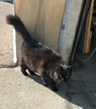 Funnet utenfor lagerbygningen på baksiden av Rema. Drakk fra en liten vannpytt når en av de ansatte kom ut. Katten kom løpende og mjauet sårt. Full av tover og mark i pelsen bak.