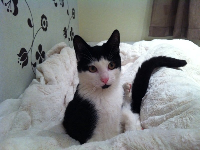Svart og hvit pusekatt på bare 6 md. Kjennetegnet hans er en svart flekk under haken. Han har helt hvite labber, mens overdelen er svart. Rosa poter.