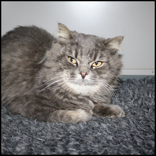 Semilanghåret, gråfarget pels med litt hvit, tigrete. Noe flat i ansiktet, mulig perser blanding. Ukastrert ikke id-merket hannkatt.